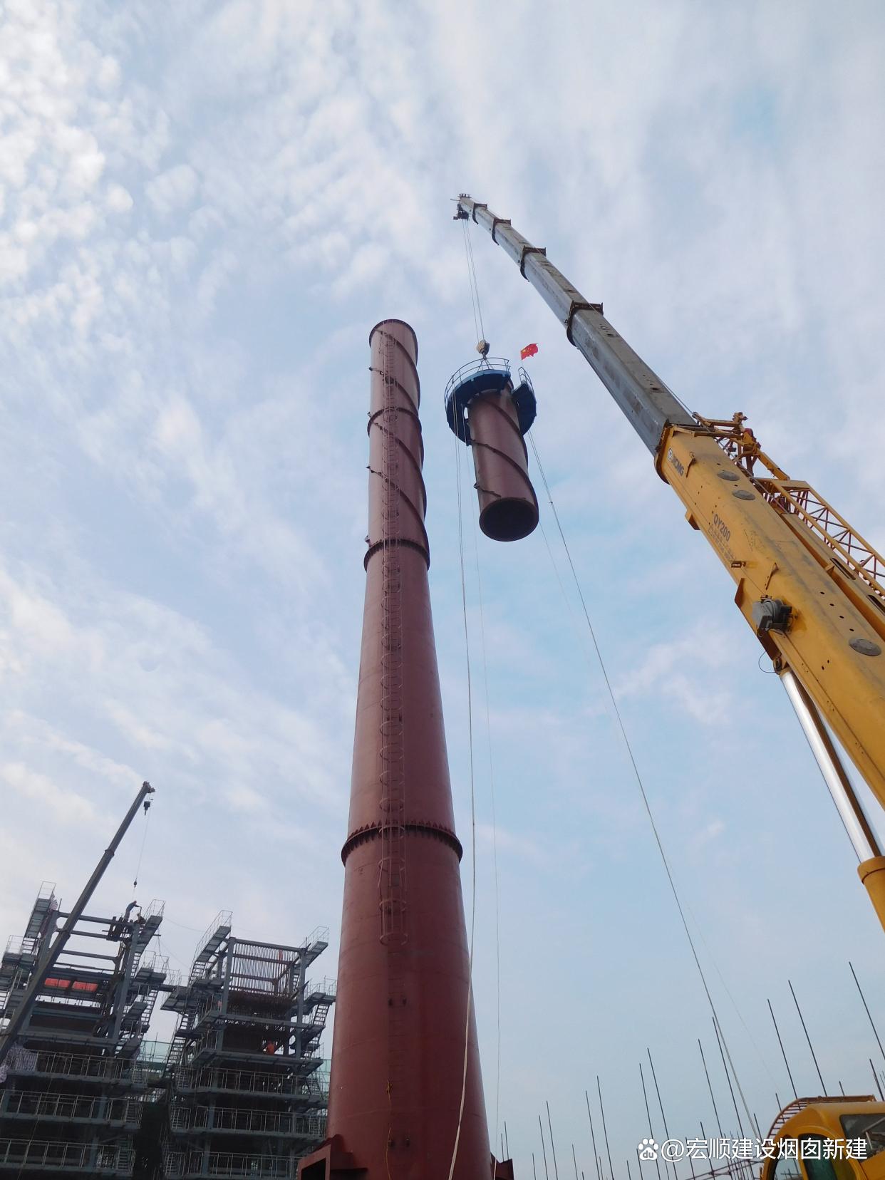 正裝法:適用于較低高度的鋼煙筒加高,通過(guò)吊車逐段吊裝加高部分。